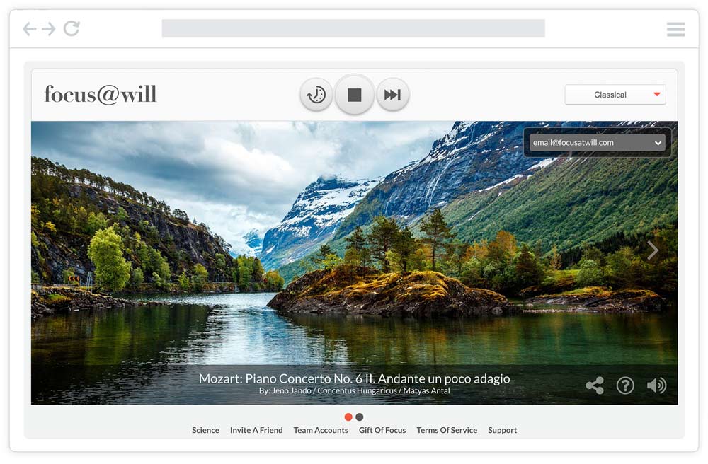 این اپلیکیشن برحسب شخصیت شما موسیقی معرفی می‌کند. این موسیقی به بهبود تمرکز و بهره‌وری در کار کمک می‌کند؛ چرا که تنها ویژه شخصیت منحصربه فرد شما ‌است. این برنامه شگفت‌انگیز ترکیبی از علوم اعصاب و موسیقی برای افزایش بهره‌وری شما است. این برنامه در ابتدا به مدت ۷ روز رایگان است و بعد از آن باید نسخه پریمیوم خریداری شود که مبلغ آن ۹۹/۳۳ دلار در سال است.